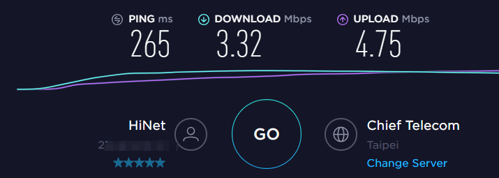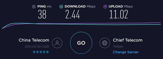 在我们未使用 Purevpn 的时候,我们使用中国电信的网络进行测试,这是我们本地网络的测试截图: