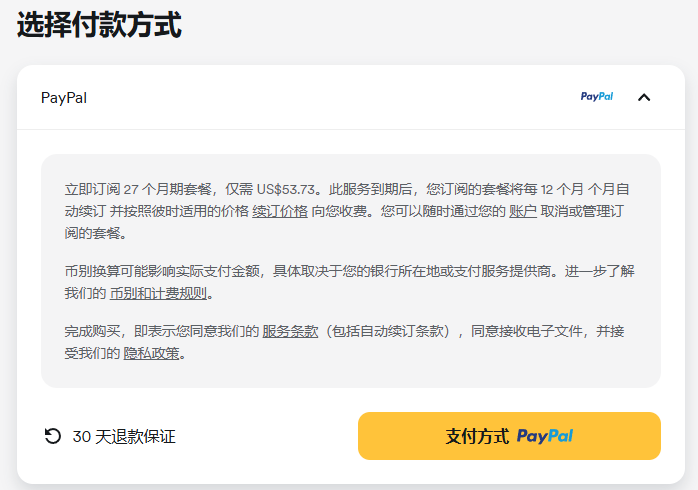 很多国内的小伙伴可能使用支付宝支付习惯了,目前 surfshark 虽然移除了支付宝付款、银联的选项,但是使用 PayPal 的方式支付仍旧相对方便。