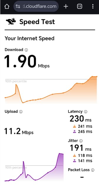 Download :1.90 Mbps;Upload:11.2 Mbps 。