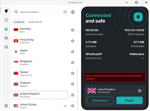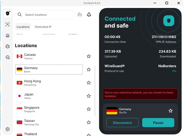 在中国地区的 ip 打开 surfshark 客户端,都会提示:Due to your restrictive network,you can connect to fewer locations.