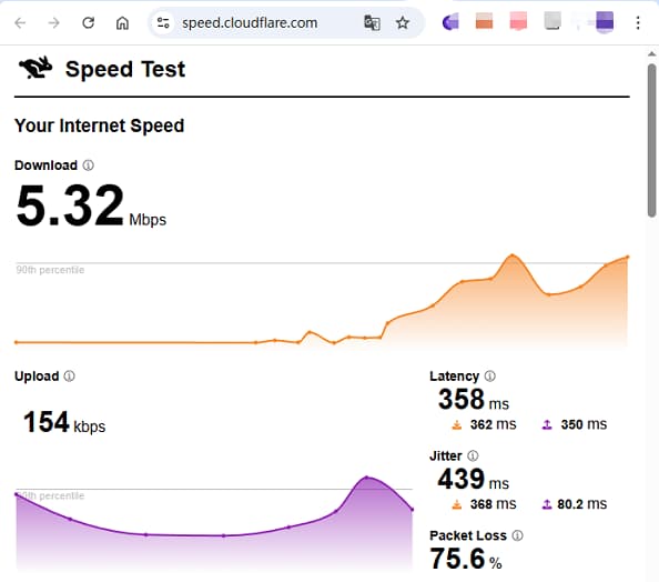Download :5.32 Mbps;Upload:154 kbps 。