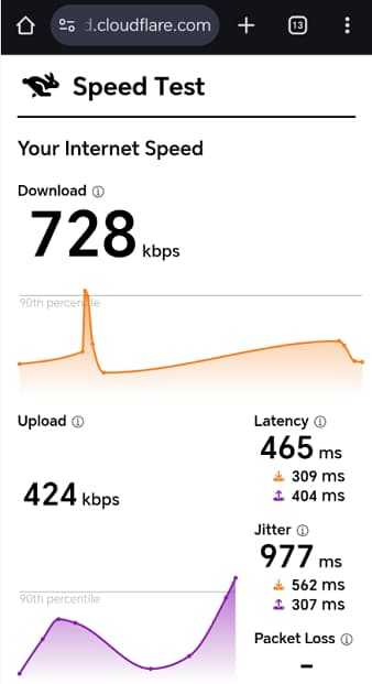 Download :728 kbps;Upload:424 kbps 。