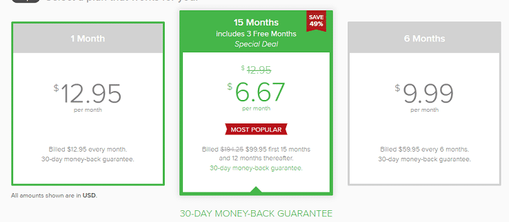 其單月購買價格為 12.95 美元,按月買價格非常不划算。它們還提供包年和半年套餐,價格相對來說優惠很多。特別是按年買的套餐,如果你通過本站專屬優惠鏈接來購買,購買12個月還贈送三個月,其平均下來每個月只要 6.67 美元: