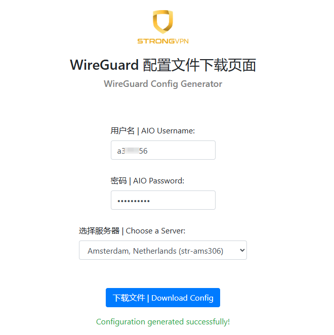 然後下載 WireGuard 配置文件,配置文件下載地址:https://tools.strongtech.org/share/strong-wg/strong-wg.html